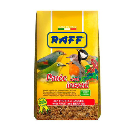 Raff Patee con insetti es un alimento en forma de pasta húmeda con insectos para pequeños pájaros insectívoros de pico fino. También puede utilizarse como complemento en la alimentación de jilgueros y otros pájaros silvestres granívoros durante el periodo de cría